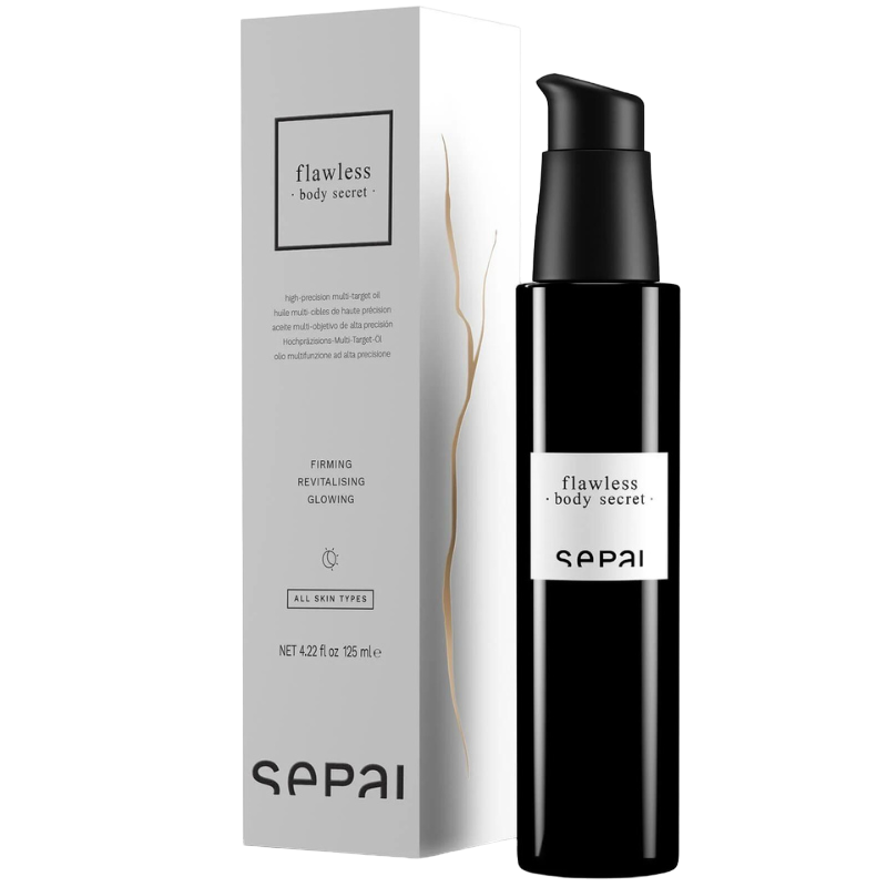 The FLAWLESS BODY SECRET by SEPAI is a powerful, concentrated body oil serum that pampers the skin with the same high-quality care ingredients found in SEPAI facial products. It works deeply and combats the signs of skin aging - dryness, loss of elasticity, cellular aging, and premature aging due to UV radiation and free radicals. FLAWLESS BODY SECRET is very economical; just a few drops make your skin appear visibly younger, firmer, and more defined after the first application. The special "Retin-less technology" used in the FLAWLESS line fights the signs of premature skin aging and aims to enhance the skin's elasticity and firmness. For flawless skin without the potential intolerances that retinol can cause. FLAWLESS BODY SECRET is Vegan. Free from parabens, isothiazolinones, imidazolidinyl urea, allergenic preservatives, BHT, BHA, aggressive emulsifiers and surfactants, petroleum-based ingredients (paraffins, petrolatum, PEG), silicone, allergens, solvents, additives, potentially skin-irritating substances, and more. Here in travel size.