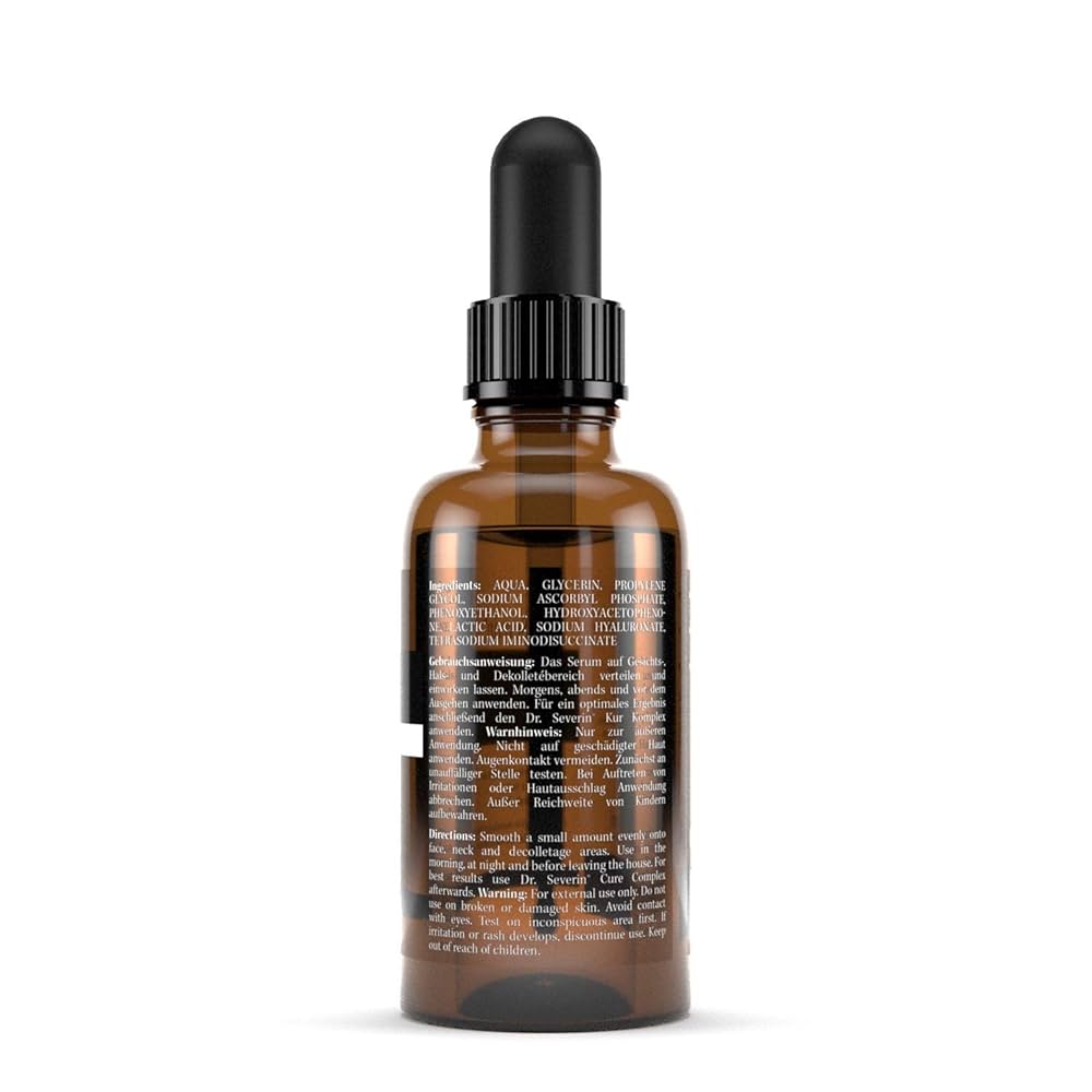 Smooth skin, seconds after application. The innovative active complex of hyaluronic acid and vitamin C makes this possible. The Dr. Severin Vitamin C Hyaluron Serum is the perfect companion for an instant anti-aging boost. The optimally dosed combination of low & high molecular hyaluronic acid works in two ways: it acts immediately against wrinkles in the upper skin layer and long-term by penetrating deeper skin layers. Dr. Severin has developed the ideal ratio of active ingredients and embedded them in a pH-ideal environment. This allows your skin to easily absorb the active ingredients. Wrinkle reduction is visible after just a few minutes. Vegan.