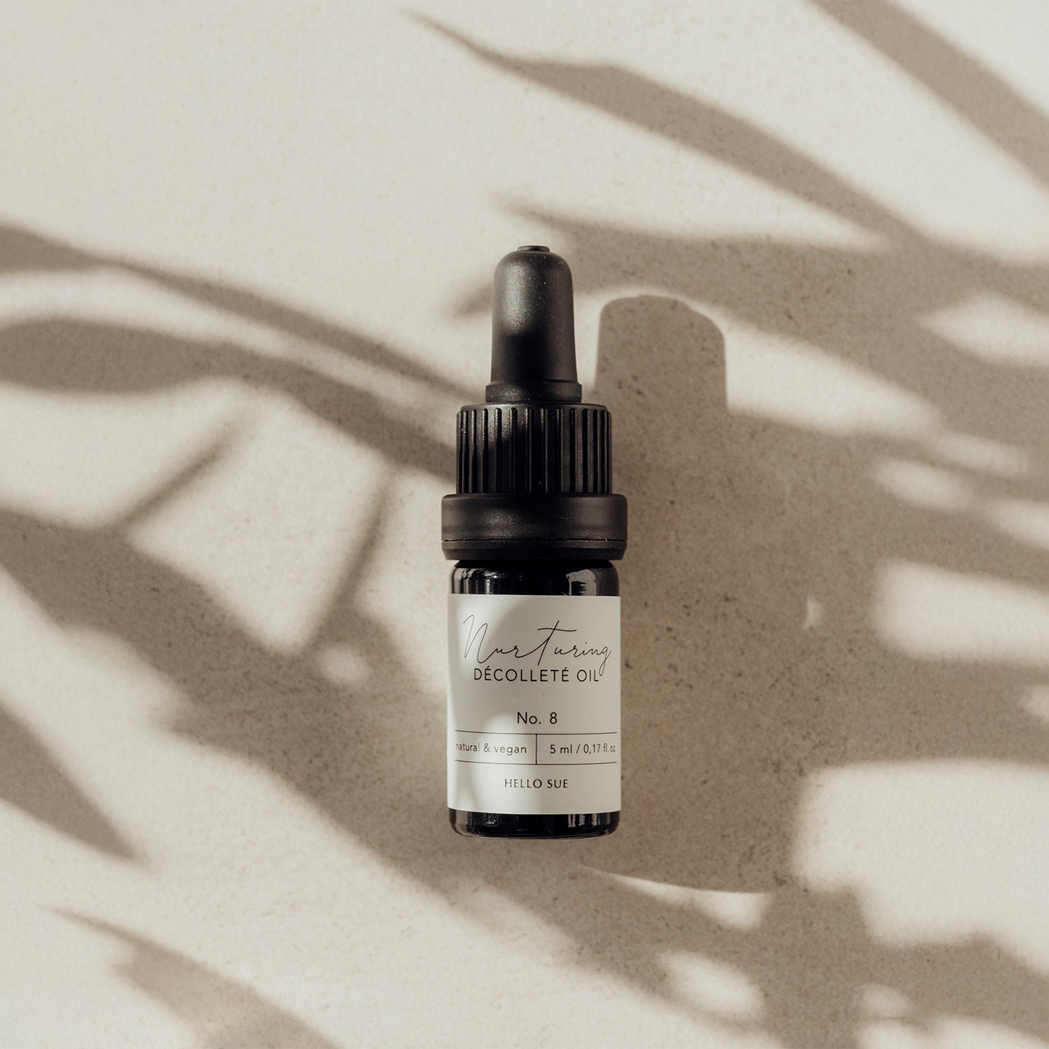 Discover the Hello Sue No. 8 Nurturing Decollete Oil, specially developed for the delicate skin in the decollete area. You will immediately feel the nourishing and nurturing effect of this high-quality oil. With a unique combination of natural ingredients, the decollete oil provides intense moisture and promotes the elasticity of your skin.