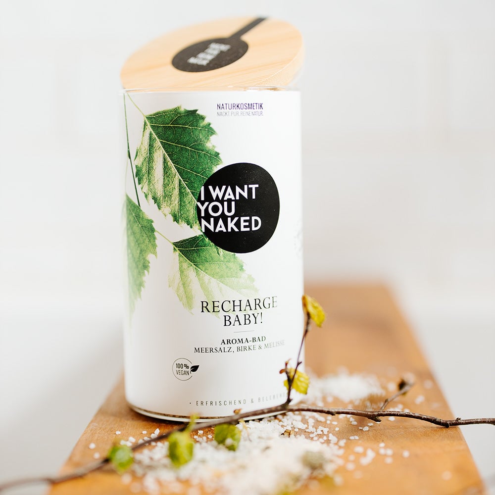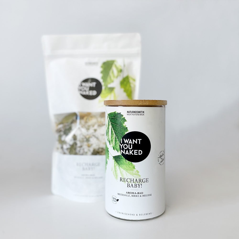 This bath is your personal battery. Packed with energy-giving active ingredients from nature. So jump into this refreshing bath and you will emerge activated and full of drive, ready to save the world. Mineral-rich sea salt charges your reserves. Vitamin C strengthens and releases new powers. Birch, lemon balm, and marigold have a tightening and activating effect, giving you and your skin a boost. "RECHARGE BABY" Aroma Bath Sea Salt, Birch & Lemon Balm from I want you naked provides your mind and body with new energy thanks to the combination of powerful healing plants. Compared to a conventional bath additive, the included sea salt moisturizes your skin and regulates the natural acid protection. Your skin will be activated, refreshed, and strengthened. Aroma Bath Sea Salt, Birch & Lemon Balm is 100% natural, without synthetic fragrances, colors, and preservatives, silicones, paraffins, or mineral oil-based raw materials. Fantastic content, sustainably packaged. This aroma bath is filled in a beautiful glass with a real bamboo lid. Too good to throw away: Feel free to reuse it and order our practical refill packs.