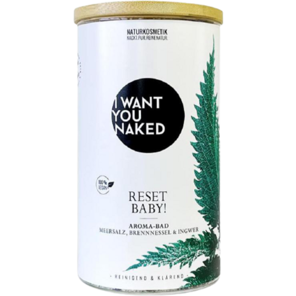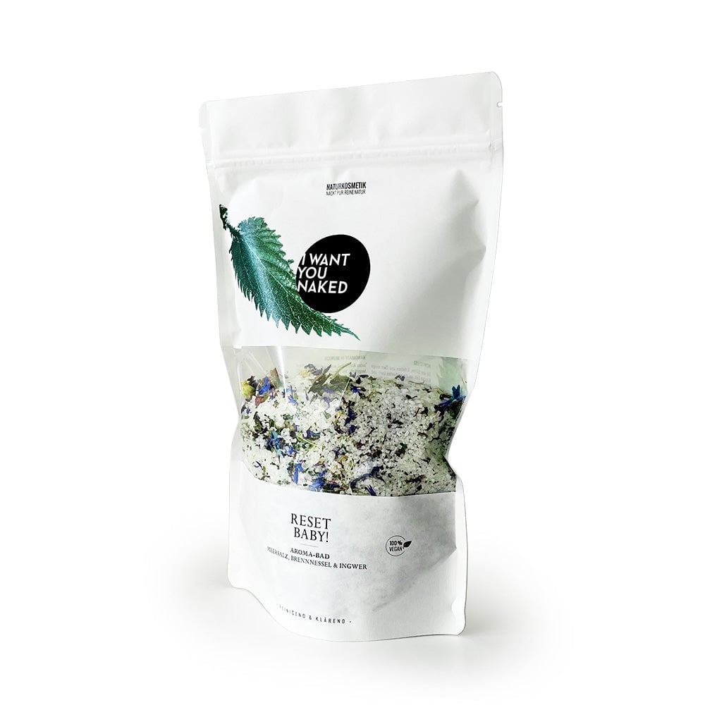 Here we go! After this bath, you won't suddenly be young again. But you will feel that way. Because with this bath, you get a powerful dose of natural detoxification. Out with all the baggage, in with the good active ingredients. And you can relax completely, because your skin takes care of all of this for you. Boosted by effective healing plants, mineral-rich salts, and fine oils. From sea salt, Epsom salt, nettle leaves and seeds, hydrangea, cornflower, lemon verbena, essential ginger and basil oil. This high-quality "RESET BABY" Aroma Bath Sea Salt, Nettle & Ginger from I want you naked works detoxifying, cleansing, and uniquely liberating thanks to nettle and Epsom salt. Tensions and toxins are released, and the fine oils from ginger and basil give the bath a lemony-fresh aroma – a revitalizing feel-good experience for body, mind, and soul. Aroma Bath Sea Salt, Nettle & Ginger is 100% natural, without synthetic fragrances, colors, and preservatives, silicones, paraffins, or mineral oil-based raw materials. Fantastic content, sustainably packaged. This aroma bath is filled in a beautiful glass with a real bamboo lid. Too nice to throw away: Feel free to keep using it and order the practical refill packs.