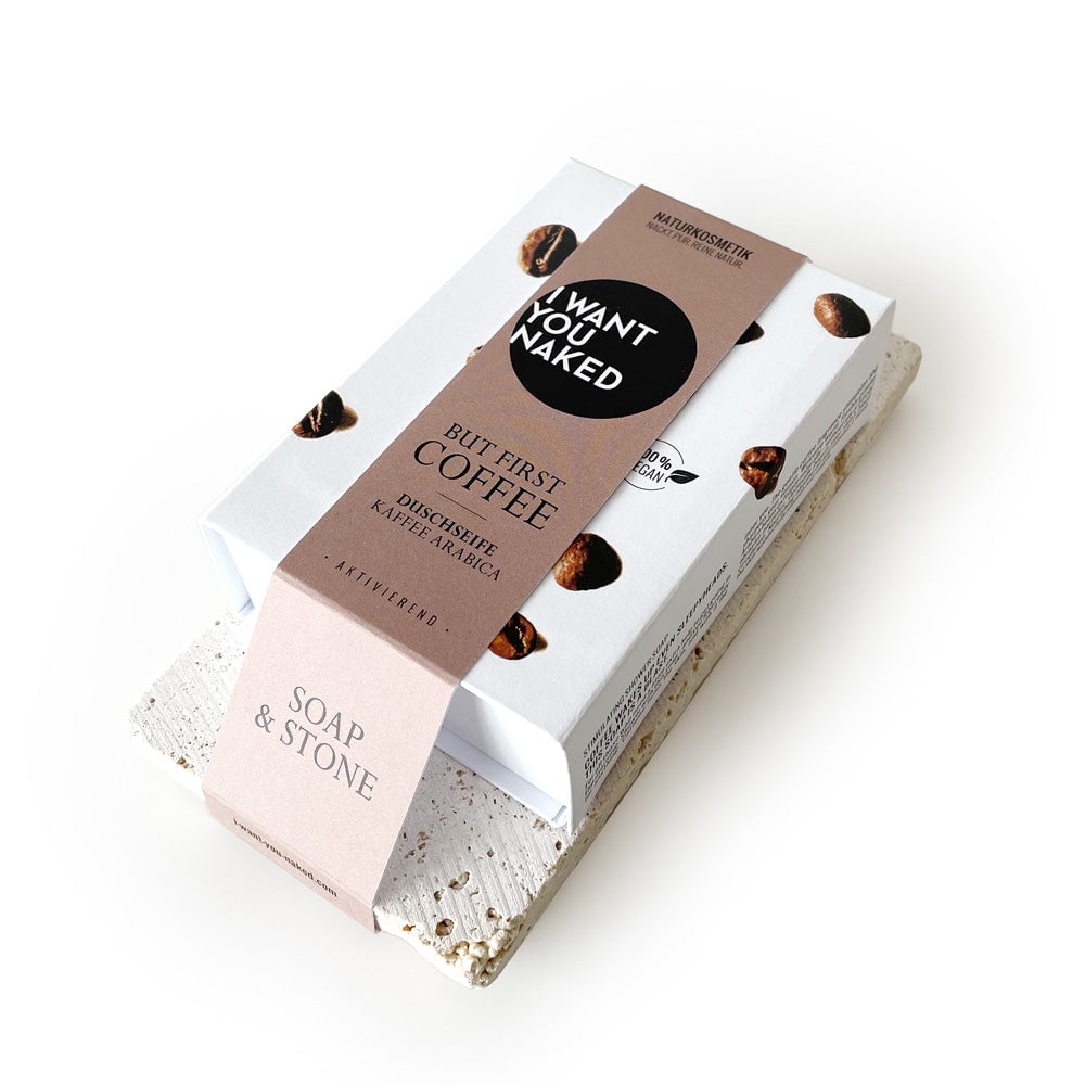The perfect pair: BUT FIRST COFFEE shower soap with coffee & almond oil & the Naked Stone in a set.