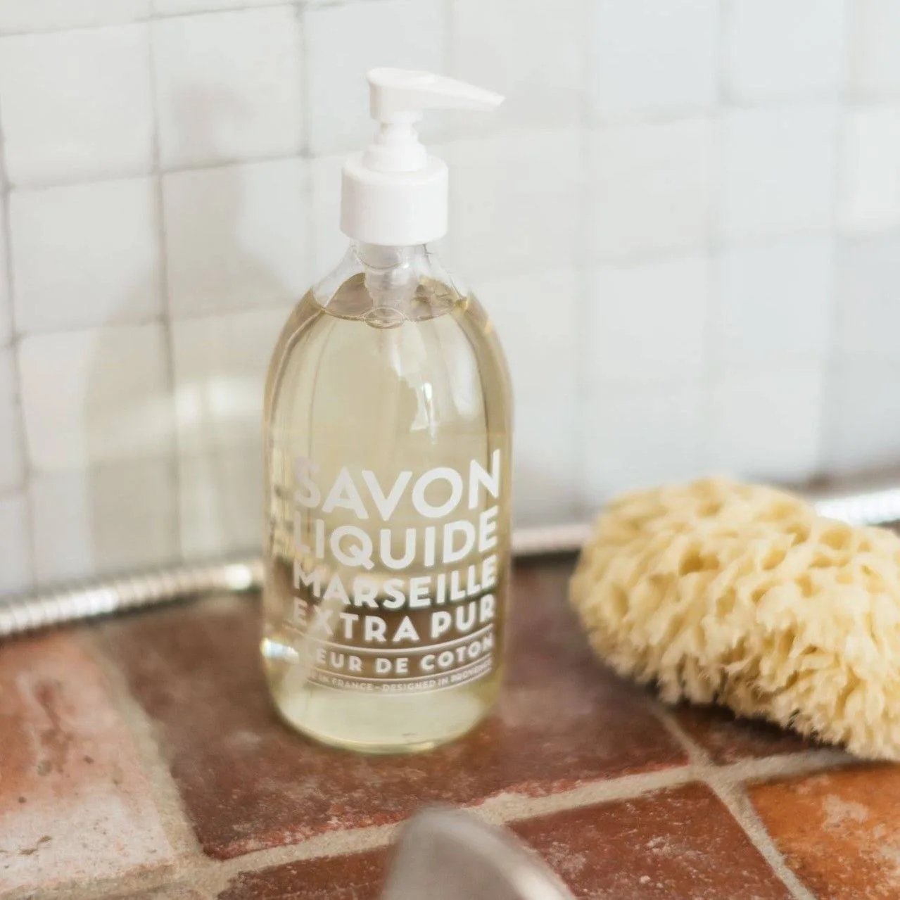 The liquid soap from La Compagnie de Provence is traditionally made through saponification in a cauldron – just like its ancestor, the iconic soap cube from Marseille. The Liquid Marseille Soap Cotton Flower transforms into a creamy lather upon contact with water, effectively cleansing the skin with olive and sweet almond oil from Provence and grape seed oil from France. The ultra-gentle formula is not only perfect for frequent hand washing, but it can also be excellently used for cleansing the entire body. The floral, delicate, and powdery scent of the soap envelops the senses and wonderfully evokes the unique softness of cotton. Liquid Marseille Soap Cotton Flower comes in an elegant and colorful glass pump bottle – a real eye-catcher in the bathroom and kitchen. Liquid soap with 95% natural ingredients.