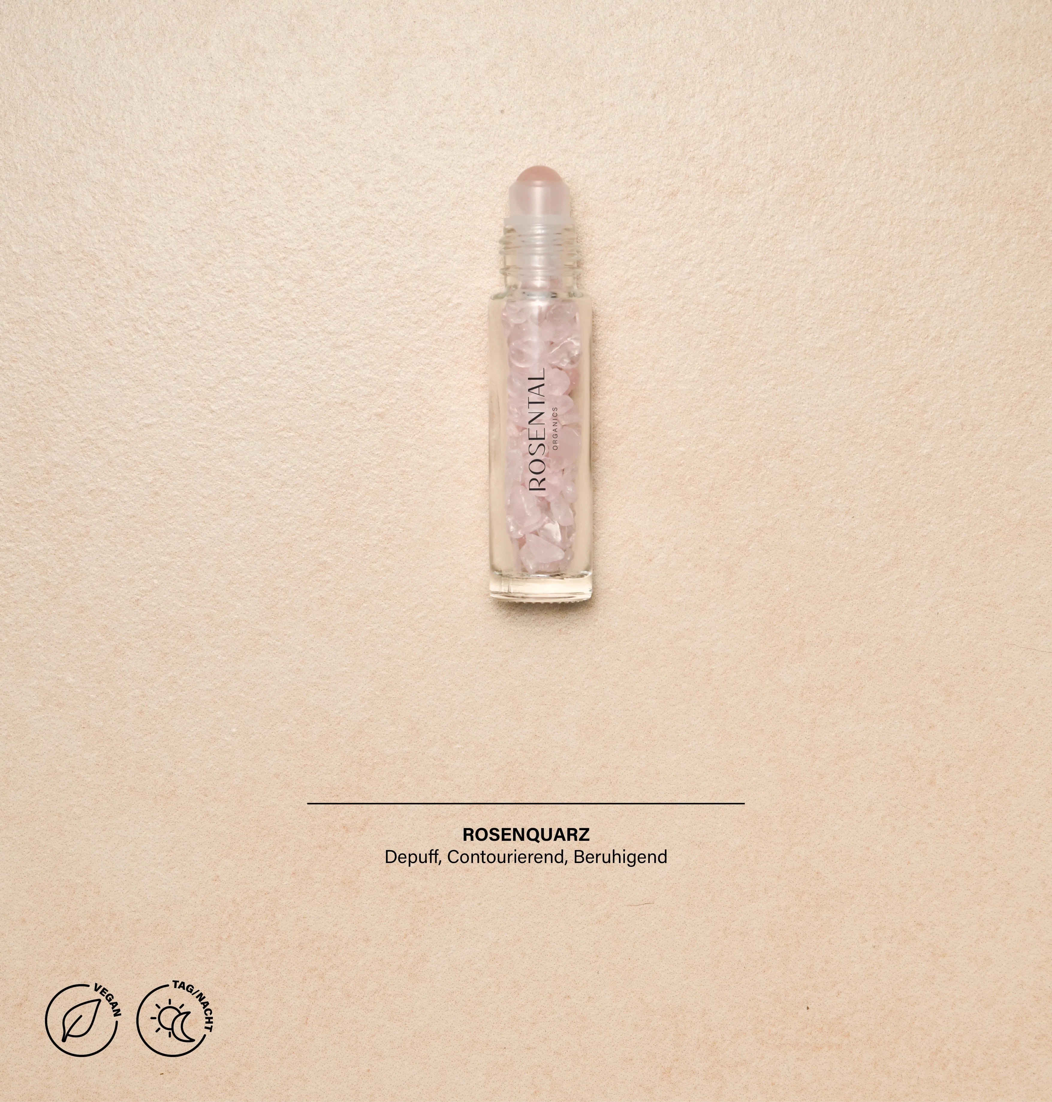 Enhancing facial massage & revitalizing refreshment on-the-go? Are you in the mood for Face Yoga – whether traveling, at the office, or just on the move? Wherever you are, the new Face Yoga Roll-On Set makes it possible! Because the ultimate set solution, consisting of the Rosental Organic Squalane 30ml and the Face Yoga Roll-On with cooling rose quartz ball applicator (Gua Sha), combines care & tool in one – all in a convenient to-go size for the ultimate recharge in between! With the combination of serum and roll-on applicator, you’ll see maximal results, thanks to the blend of skin-nourishing ingredients and rejuvenating acupressure. The gentle massage promotes circulation under the eyes, making them rosier & more relaxed. At the same time, it minimizes deposits, which helps dark circles disappear in the long run. In addition to the relaxation effect on the eye muscles, the gliding motion stimulates the lymphatic system, thereby relieving existing lymph congestion – reducing blockages in the face, transporting away toxins, cleansing the skin from within, and reducing acne and impurities. The massage with the Gua Sha tool on the temples, neck, shoulders, and behind the ears provides pain relief and is thus optimal against migraines, headaches, and neck pain. Fill the Rose Quartz Face Yoga Roll-On with the treatment of your choice, shake briefly to mix with the rose quartz stones & massage in! When the roll-on is empty - refill! Easy, right? Suitable for all skin types. Vegan.