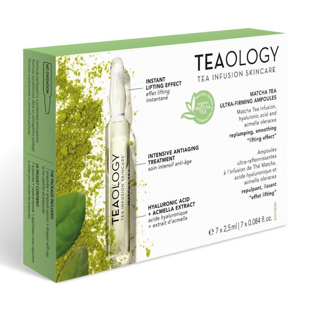 The Matcha Tea Ultra Firming Ampoules from TEAOLOGY provide your skin with an instant lifting effect, plump, smooth, and offer an intense anti-aging experience. Each glass ampoule contains a concentrate with the antioxidant power of matcha tea, the moisturizing and plumping effect of molecular hyaluronic acid, and the immediate lifting effect of acmella oleracea extract (Paracress). This formulation, with remarkable, instantly visible results, has been designed to even out and brighten the skin tone, smooth fine lines and wrinkles, and erase signs of stress and fatigue. Each ampoule contains the perfect dosage of: Organic matcha infusion, rich in antioxidants and minerals that combat aging processes in cells and protect the skin from environmental stress. Hyaluronic acids to maintain moisture levels in the different skin layers of the epidermis and the skin's hydrolipid barrier. Acmella oleracea (Paracress), a unique plant that instantly smooths the skin and creates a natural lifting effect. After the first application, wrinkles and signs of skin aging are already visibly reduced, and the skin is softer, firmer, and more radiant. Suitable for all skin types. Content: 7x 2.5ml.