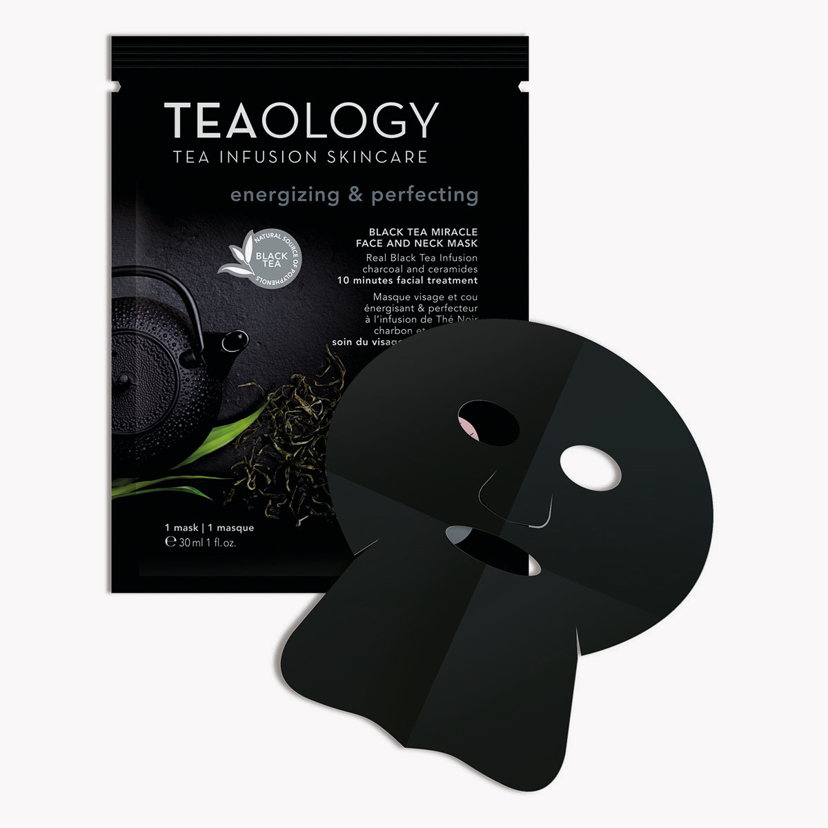 The secret of the Black Tea Miracle Mask by TEAOLOGY is the special fabric soaked in real black tea that adheres perfectly to the face and neck. It stays in contact with the skin and has a double effect: it prevents the energizing active ingredients from escaping and helps the skin absorb them completely. The black tea infusion, rich in antioxidant polyphenols, enhances the firming effect of caffeine and guarana. Ceramides and charcoal powder nourish and perfect the complexion. After just 10 minutes, the face transforms and appears fresher, firmer, and younger. Apply the mask after using a cleanser on the face and neck. Leave on for 10 to 20 minutes. Massage any excess mask into the skin until fully absorbed. For long-term results, use the mask twice a week and whenever you need a quick beauty boost.