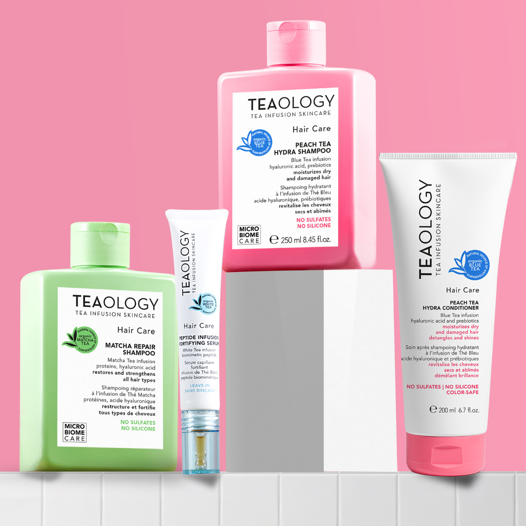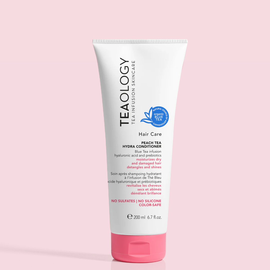 The Peach Tea Hydra Conditioner by TEAOLOGY. The advanced, sulfate- and silicone-free formulation contains an infusion of blue tea instead of water, hyaluronic acid, and probiotics, and safely cares for color-treated hair without fading it. The powerful cream conditioner smooths, detangles, strengthens, and revitalizes with next-generation hyaluronic acid, designed to keep hair well-hydrated even after rinsing. Antioxidants and clinically confirmed tea infusion protect against pollution and dryness, hydrate, and preserve the vibrancy of curls. Nourishing camellia seed oil enhances shine and combats hair breakage with the support of a probiotic complex that additionally strengthens the scalp and boosts hair vitality. Italian peach extract provides a fresh, allergen-free scent and leaves hair silky and easier to comb. Suitable for all hair types. 97% natural ingredients. Vegan. Biodegradable. Dermatologically and nickel tested.