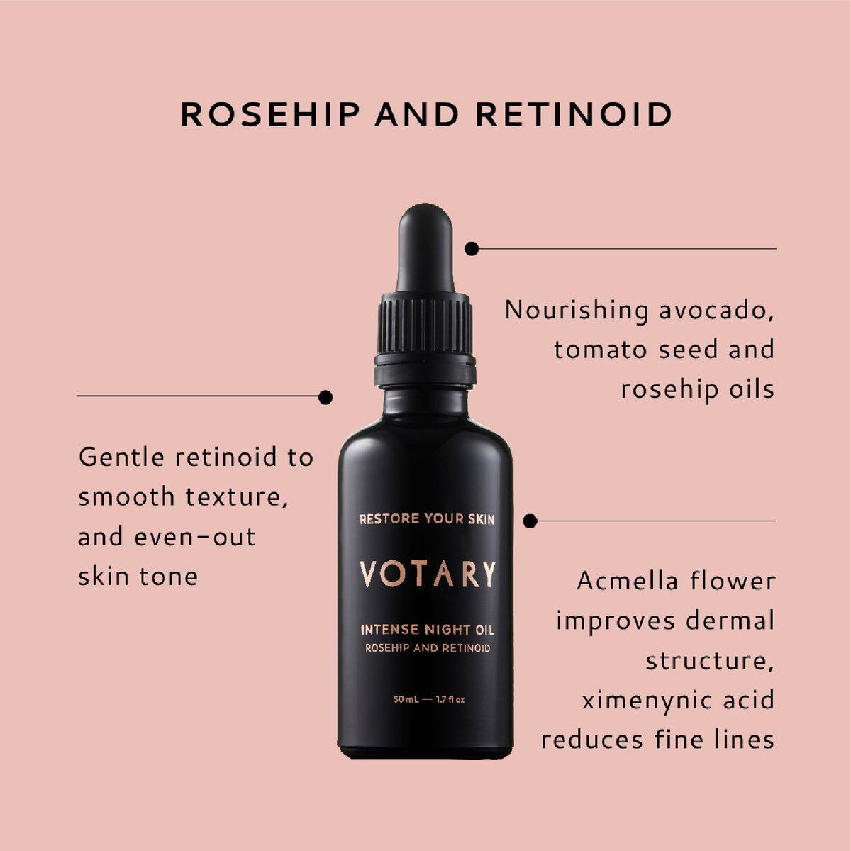 Votary Intense Night Oil combines rosehip and retinol into a velvety texture that evens out skin tone and leaves skin looking younger and plumper. During the aging process, skin loses moisture and elasticity, while fine lines, wrinkles, and pigmentation spots increase. The Intense Night Oil stimulates cell production and reduces collagen breakdown, making the skin firmer and softer. Intense Night Oil is packed with the most effective ingredients from nature. Delicate scents of rose oil, avocado oil for vitamin K, tomato seed oil for lycopene, and provitamin A for antioxidants. Extracts from the Acmella flower have been shown to improve skin texture and make it firmer, while Australian sandalwood extract is a natural source of ximenynic acid, which reduces redness and fine lines. These luxurious, natural ingredients combine with rosehip and retinol to nourish and regenerate the skin. Vegan. Natural plant power with proven effective lab retinoic acid. Should not be used during pregnancy.