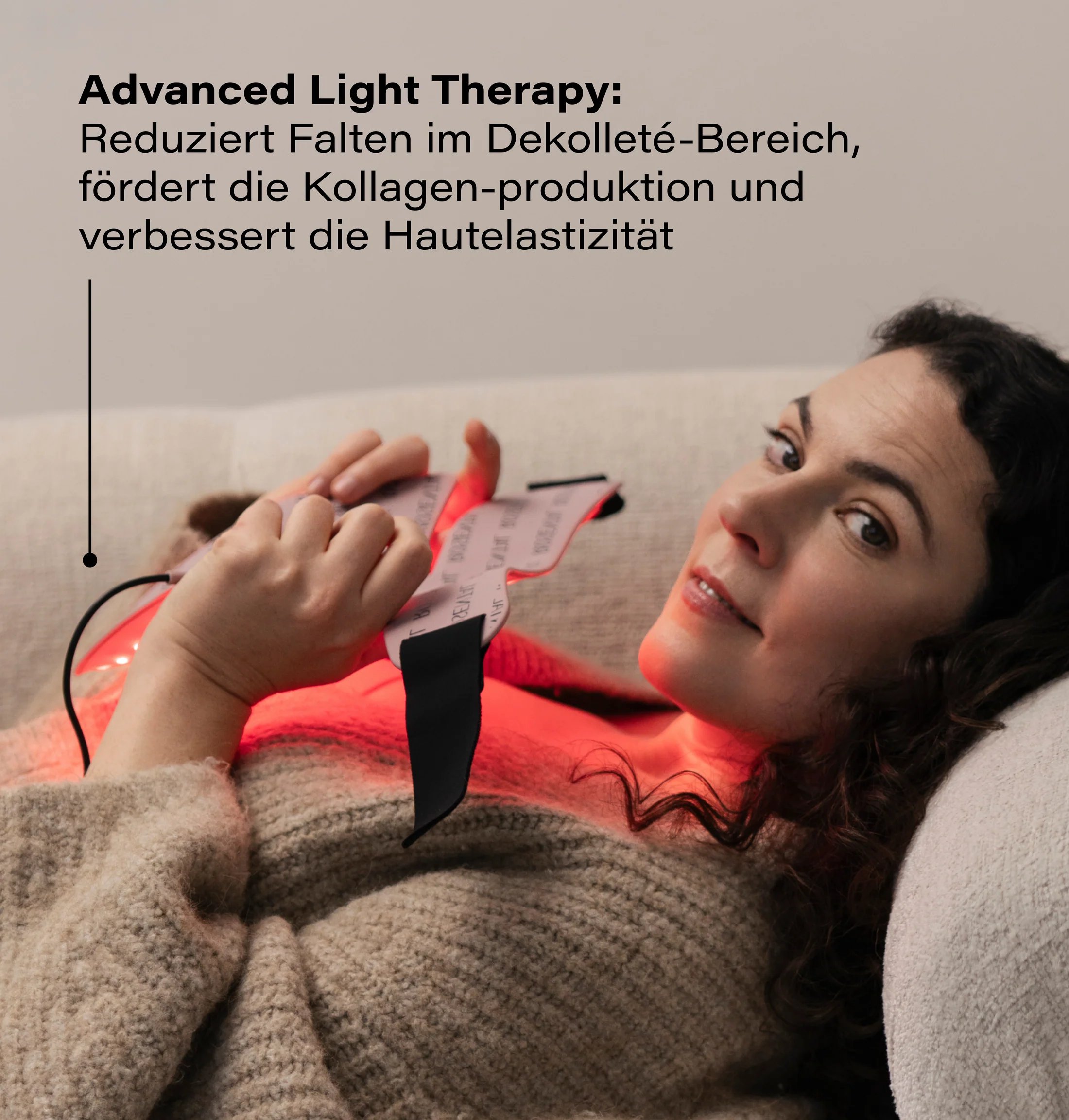 Hochwertige LED Décolleté Mask für Zuhause: mit vier wirksamen Modi für einen sichtbaren Slow-Aging-Effekt* im Dekolleté- und Halsbereich. Geförderte Kollagenbildung, verbesserte Hautelastizität und -regeneration wirken gegen Falten und Hyperpigmentation. Die Wellenlängen dringen tief in die Hautschichten ein und bieten so eine professionelle, sichere und schmerzfreie Behandlung Zuhause – individuell auf deine Bedürfnisse einstellbar und ohne Risiken.