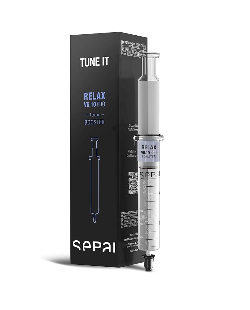 V6.10 RELAX PRO Tune it is a muscle-relaxing extract with a Botox effect for the customization of your SEPAI facial care. It interrupts the irritation of nerve cells in the skin and prevents muscle contraction. This results in a strong relaxation of the facial muscles. With an immediate tightening effect, it additionally increases collagen synthesis. Mix V6.10 RELAX PRO with a booster and/or a moisturizer from the SEPAI Urban or Recovery line. Do not apply it directly to the skin! Vegan. Free from parabens, isothiazolinones, imidazolidinyl urea, allergenic preservatives, BHT, BHA, aggressive emulsifiers and surfactants, petroleum-based ingredients (paraffins, petrolatum, PEG), silicone, allergens, solvents, additives, potentially skin-irritating substances, and others.