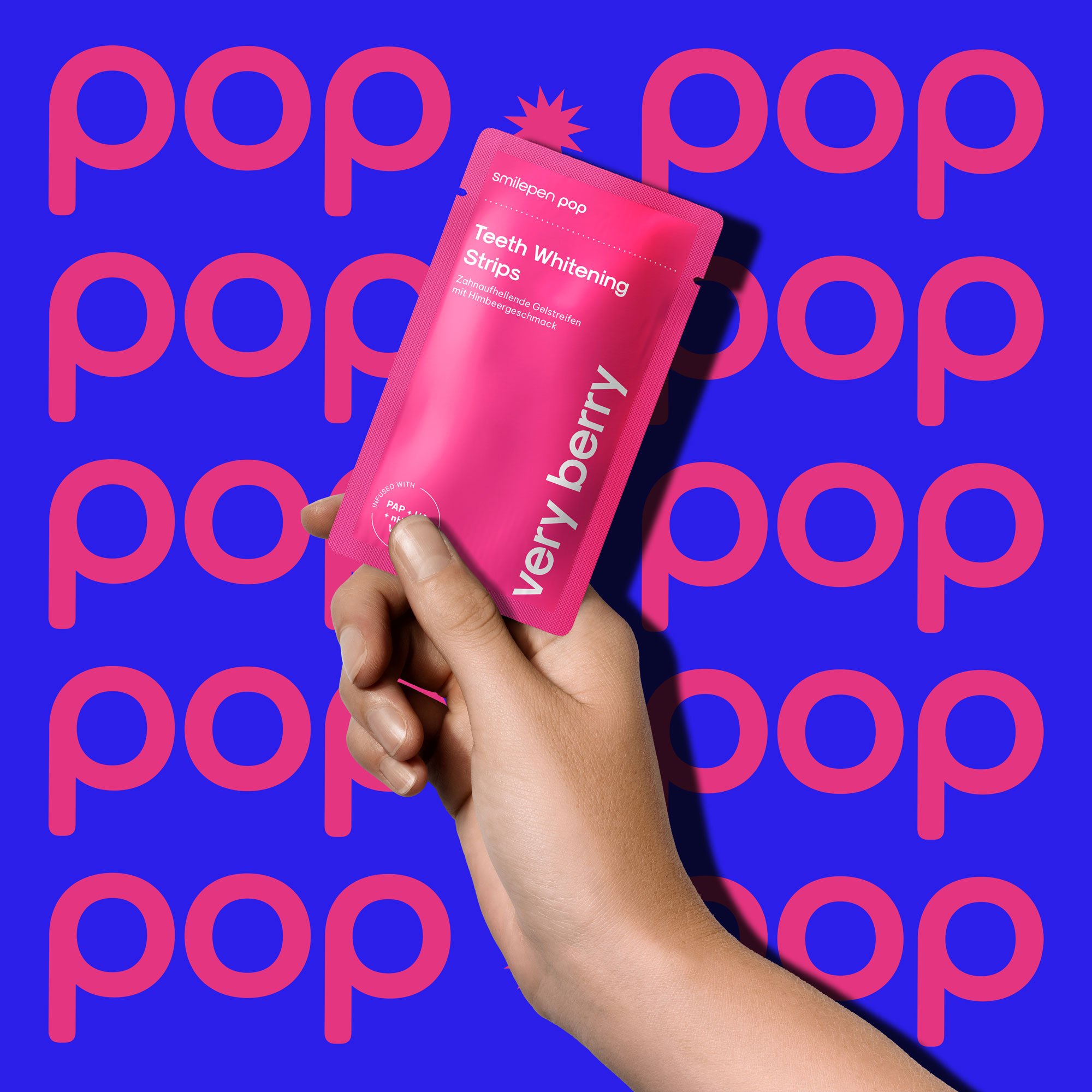 Moderne Zahnaufhellung mit den Pop "Very Berry" Teeth Whitening Strips. Der süsse und spritzige Kick von Himbeeren macht das Aufhellen der Zähne zu einem angenehmen Erlebnis.